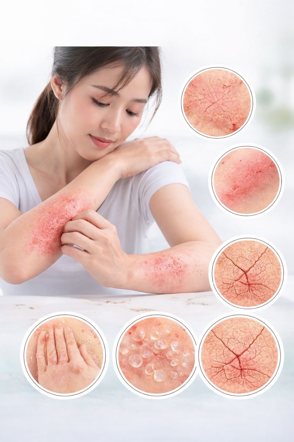 • Sẩn đỏ & Mụn nước: Da xuất hiện các mảng đỏ, có thể rỉ dịch trong giai đoạn cấp tính.