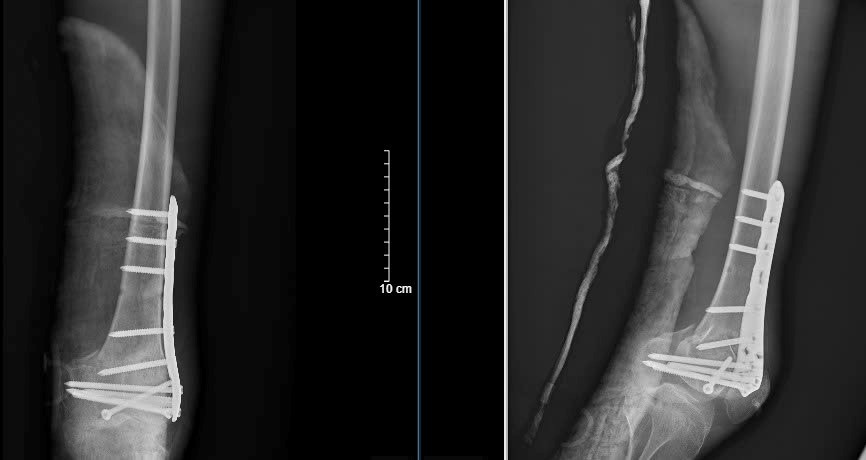 Cuộc mổ tiến hành trong 2 giờ đồng hồ, các mảnh gãy được nắn chỉnh chính xác, hệ thống nẹp vít được đặt đúng vị trí dưới kiểm soát liên tục của C-arm. Hậu phẫu, bệnh nhân tỉnh táo, vết mổ khô, tình trạng đau được kiểm soát tốt, chức năng vận động chi dưới được theo dõi sát. Bệnh nhân được hướng dẫn tập phục hồi chức năng sớm theo phác đồ nhằm hạn chế cứng khớp và teo cơ.